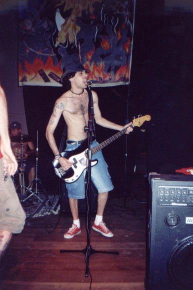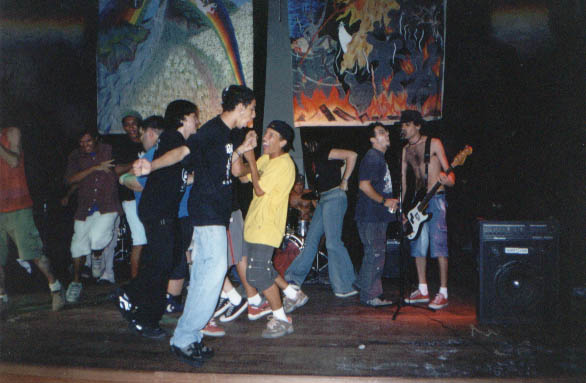 Show com as bandas Coice de Mula, Etaks e Súditos. Escola Oscar Vilares - Próx. Estádio Radio de Mococa - Mococa - SP - 15:00 horas - Entrada franca. Após duas horas de viagem chegamos a Mococa e foi bem fácil localizar onde seria realizado o show. Chegamos lá bem na hora que estava começando um campeonato de skate que fazia parte do evento. O lugar já estava lotado e foi bem legal ver os competidores dando o sangue nas manobras. Mas como fazia pouco tempo que tínhamos almoçado estávamos com sede e fomos a um pequeno boteco local matar a sede. Botequinho fervendo e tinha alguns "barflys" bastante simpáticos, tomamos umas 3 cervas e saímos com mais umas latinhas em direção ao show. O local do show era no teatro da escola, o tipico teatro de escola com aquelas cadeiras de madeira fixadas no chão. O palco era legal e grande e tinha até algumas artes no fundo simbolizando o bem e o mal. A primeira banda a tocar foi o Súditos (será que é este o nome da banda?) que tinha um lado bem pop, mas isto porque as músicas eram boas, mas como era a primeira banda todo mundo assistiu sentado. Depois foi a vez de nós tocarmos e o nosso camarada Joey, lá de Mococa, insistia para a gente deixar os pedestais de microfone nos cantos porque a galera iria agitar no palco e eu nem acreditei. hehehe... Mas foi só a gente começar que o bicho pegou em cima do palco, devia ter no mínimo umas 15 pessoas agitando em cima do palco, eu no canto direito, Viril no canto esquerdo e nosso batera no fundo. Mas foi um show animal, sem dúvida um dos mais legais que já fizemos, não digo isto porque tocamos bem e sim pela reação da galera. Quase nem precisei cantar porque todo mundo já conhecia as letras do nosso primeiro cd. No final da última música ainda fomos carregados pelo pessoal de lá. Foi foda. Vendemos todas camisetas que levamos e mais alguns cds, tivemos que dar algums autógrafos e tirar algumas fotos, coisas que não estamos acostumados. Mas valeu pelo carinho e receptividade. A última banda a tocar foi a Etaks, banda de skate punk bem interessante de Mococa. E o show deles também foi bastante agitado com muita gente agitando no palco.