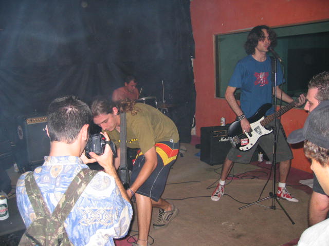 Show com as bandas Coice de Mula, Name It Yourself, All Jokers e Substar. Centro Cultural Antimatéria - R. Sacramento, 367 - Centro - Campinas SP. 16:00 - Entrada: 4 reais. Tenho que ser sincero, eu odeio organizar shows. hehehe. É muita preocupação e dor de cabeça. Sem contar o lance da divulgação e a correria atrás de equipamento, o mais foda mesmo é o dia do show. Ficar se preocupando com outras bandas para tocarem no horário, para ninguém sair prejudicado, nem as bandas e nem o público. Vale ressaltar o monte de gente que eu nunca vi na vida e quer pagar menos para entrar, tentaram até pular o portão. Ficar de olho na portaria e de olho no show para ver se está tudo bem. Bom, sei lá. É muita coisa, ainda bem que no fim deu tudo certo. Agradecimentos especiais ao nosso batera (Nano Catiola), ao Virilcius Neh que ficou cuidando do som a maior parte do tempo, ao Zé pela força na portaria e filmagem, ao Sanchez por emprestar o amps de guitarra, ao Dani pelas fotografias e as bandas All Jokers e Name It Yourself pela camaradagem. O All Jokers deveria ser a 2° banda a tocar mas como o Substar não estava querendo tocar em primeiro, o pessoal do All Jokers acabou sendo a primeira banda. Eu infelizmente não pude assistir quase nada porque foi na hora que a portaria estava com bastante movimento e tive que ficar lá para dar uma força. Mas todo mundo veio falar que o show estava bom. E eu acredito que sim. hehehe. O All Jokers é muito legal e apesar da gente ter formado as bandas quase na mesma época foi a primeira vez que tocamos juntos. E estes caras já sabem, quando precisarem de algo é só falar. Depois foi a vez do Substar, banda de SP, eu tinha mais contato com o Spark e com o Speed mas os dois sairam da banda. hehehe. Bom, eu não pude ver o show dos caras também mas teve um pessoal que gostou. Depois foi a vez do Name It Yourself, banda que eu gosto muito. Desta vez eles vieram sem o baixista que estava fervendo de febre. E nisto o Bueno (guitarrista) assumiu o baixo e eles tocaram com uma guitarra apenas. E nesta ausência de instrumentos fizeram um show com mais covers para encher o repertório. Foi muito bom o show deles, eu pude ver um pouco mais que os outros. hehehe. Gostei mesmo. E ainda eu fui chamado para tocar We do Descendents com eles, foi do caralho, apesar de eu não lembrar direito da música. hehehe. E depois foi a vez do Coice de Mula. Quem diria? 100 shows. hehehe. E foi massa. A galera agitou o show inteiro. Tinha uma figura memorável lá, o tal do "tiozão", um bêbado que ficava agitando e enchendo o saco de vez em quando. E o "tiozão" conhecia todas músicas do Coice, até os covers que nós tocamos e que a maioria não conhecia, o "tiozão" sabia cantar e tentava subir no palco para cantar (na lingua dele, é claro). hehehe... Mas foi assim, tocamos músicas de todas as épocas, mesclando elas, antigas, novas, etc. E desculpem pelo show comprido. hehehe. Estava vendo a filmagem deu 1 hora e 20 minutos de show. E olha que faltou bastante música. Eu queria ter tocado outras mas sabia que não iria dar. Preciso também dizer que eu não estava passando muito bem logo depois da quarta ou quinta música. Este negócio de beber, beber, beber e depois pular, pular, pular nem sempre dá muito certo. hehehe. Foi neste momento que eu ofereci a minha Brahma para o Sven um alemão que foi no show juntamente com outra alemã, a Corinna. Duas pessoas muito divertidas... hehehe... o Sven falou que veio no show porque falaram do Coice de Mula para ele e ele veio conferir. O cara é um especialista em cerveja, deu uma aula particular para mim. E ele estava meio puto que só tinha Skol para vender, as únicas Brahmas eram das bandas que eu tinha comprado. E o cara estava louco porque queria Brahma. hehehe. Eu prefiro Brahma também. Bom e o final do show foi o mais destrutivo até agora, eu cai derrumbando meu amplificador e logo depois veio o Nano Catiola com sua bateria em cima de mim, água e cerveja para tudo quanto é lado. Minha perna expremida em baixo da bateria. Mas é assim que o rock deve ser. Mais uma vez obrigado a todo mundo que compartilhou este importante momento com a gente. Longa vida ao rock.